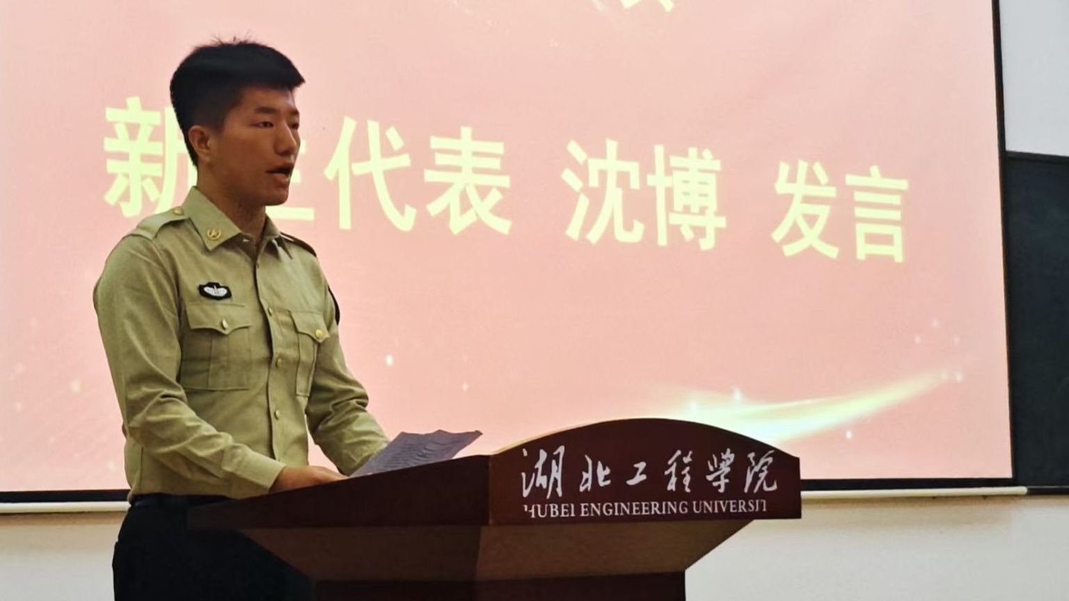 随后,退伍新生代表、小学教育专业沈博同学发言。他结合自身参军经历,分享部队生活带给他的成长与蜕变,鼓励新生珍惜大学时光,坚定理想信念,勇于挑战自我,在奋斗中书写无悔青春。